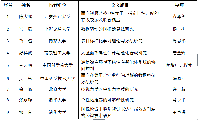 2017年度中国人工智能学会优秀博士学位论文评选获奖论文名单