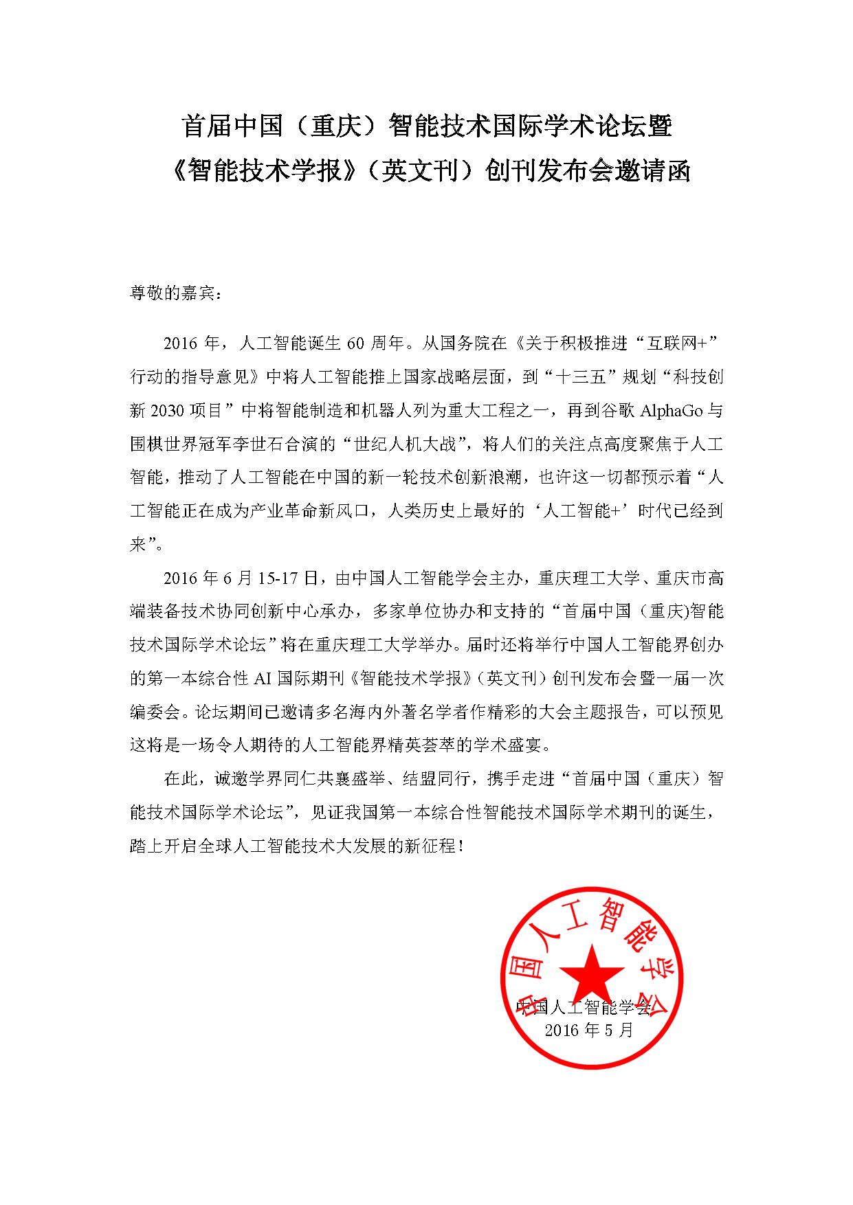 首届中国(重庆)智能技术国际学术论坛暨 《智能技术学报》(英文刊)创刊发布会邀请函