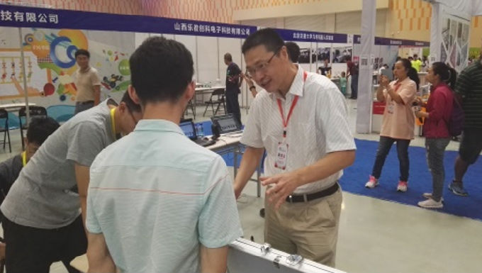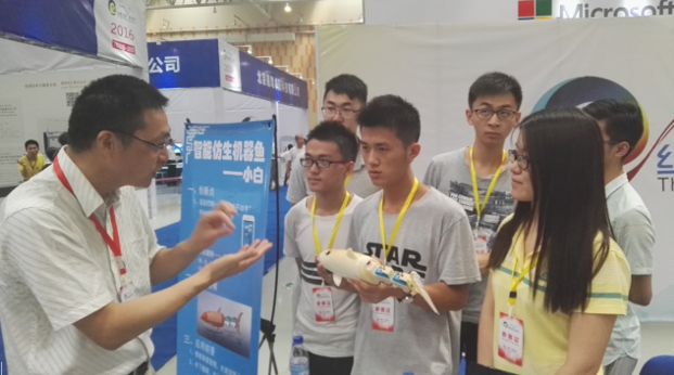 在大学生人工智能课外科技作品展示区,王国胤副理事长饶有兴致地与参展学生进行深入交流,提出对参展作品的指导意见,鼓励同学们进一步提高作品的创新性和科技水平。