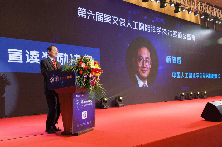 第六届“吴文俊人工智能科学技术奖”颁奖盛典由中国人工智能学会举办,网易科技与智能君博承办。中国人工智能学会常务副理事长杨放春教授宣读《奖励决定》。第六届“吴文俊人工智能科学技术奖”成就奖获得者、香港城市大学王钧教授发表了获奖感言。中国人工智能学会理事长、中国工程院院士李德毅,香港中文大学(深圳)校长、中国工程院院士徐扬生,中国科协原副主席、国际核能院院士、中国人工智能学会不确定性人工智能专委会主任张勤、深圳市人大常委会副主任,深圳市科协主席蒋宇扬、浙江大学校长,中国人工智能学会脑机融合与生物机器智能专委会主任吴朝晖、深圳职业技术学院校长贾兴东、中国科学院深圳先进技术研究院副院长吕建成、深圳信息职业技术学院校长孙涌、中国人工智能学会副理事长,重庆邮电大学研究生院院长王国胤、中国人工智能学会副理事长,北京大学深圳研究生院处长刘宏、中国科学院自动化所副所长,中国人工智能学会模式识别专委会主任刘成林、浙江大学计算机学院院长,中国人工智能学会智能CAD与数字艺术专委会主任庄越挺、武汉理工大学国家水运安全工程技术研究中心主任,中国人工智能学会智能交通专委会主任严新平、清华大学智能技术与系统国家重点实验室常务副主任,中国人工智能学会认知系统与信息处理专委会主任孙富春、北京航空航天大学计算机学院副院长,中国人工智能学会智能交互专委会主任王蕴红、北京科技大学研究生院副院长,中国人工智能学会智慧医疗专委会主任班晓娟、华中科技大学智能与控制工程研究所所长,中国人工智能学会智能机器人专委会主任黄心汉等来自政府、高校(院)所和企业界近800余名嘉宾和代表参加了活动。中国人工智能学会副秘书长、吴文俊人工智能科学技术奖办公室主任余有成主持第六届“吴文俊人工智能科学技术奖”颁奖盛典。