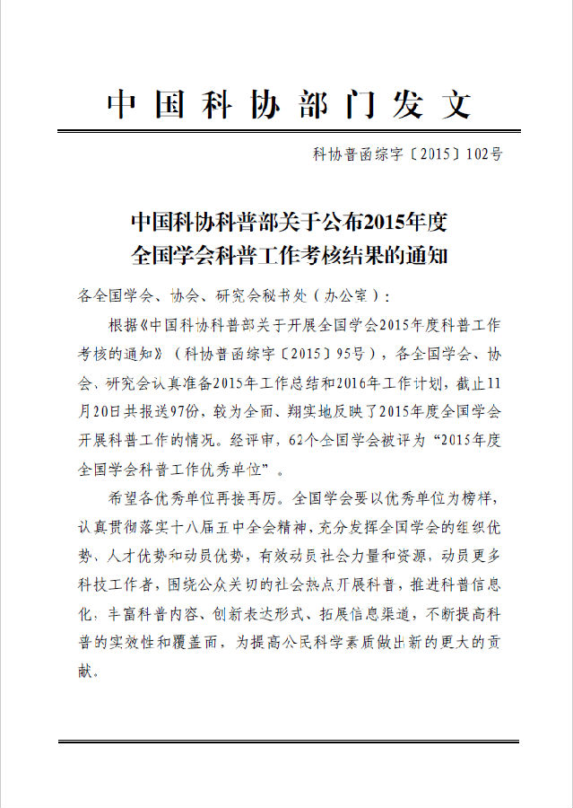 中国科协科普部关于公布2015年度全国学会科普工作考核结果的通知