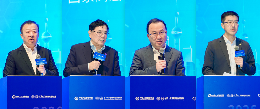 最高人民法院贺小荣二级大法官,中国人工智能学会理事长戴琼海院士,中国法学会副会长、西南政法大学校长林维教授,清华大学党委副书记过勇教授参会并致辞。