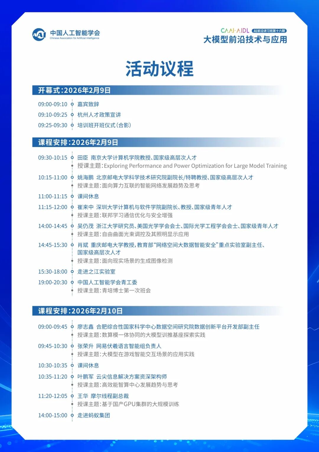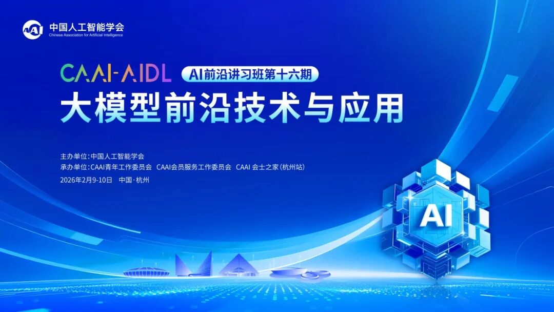 2026年2月9—10日,由中国人工智能学会(CAAI)主办,CAAI青年工委会、CAAI会员服务工委会及CAAI会士之家(杭州站)联合承办的“中国人工智能学会AI前沿讲习班(CAAI-AIDL)”第十六期将在杭州举行。本期讲习班以“大模型前沿技术与应用”为主题,聚焦人工智能领域的前沿进展与最新成果,旨在为相关从业者与研究者提供高水平的学习交流平台。