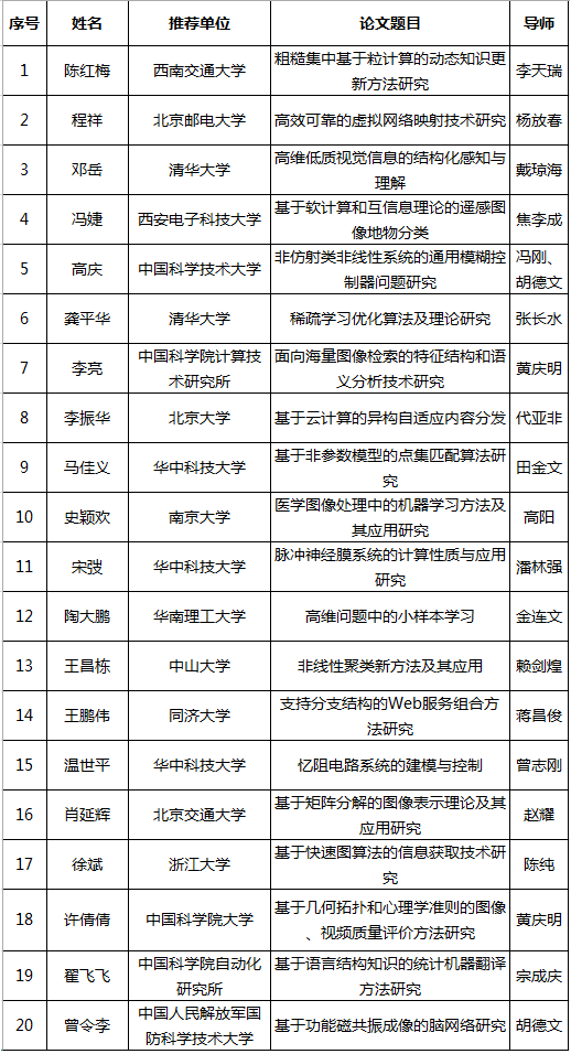 2015年度中国人工智能学会优秀博士学位论文评选终评入围名单